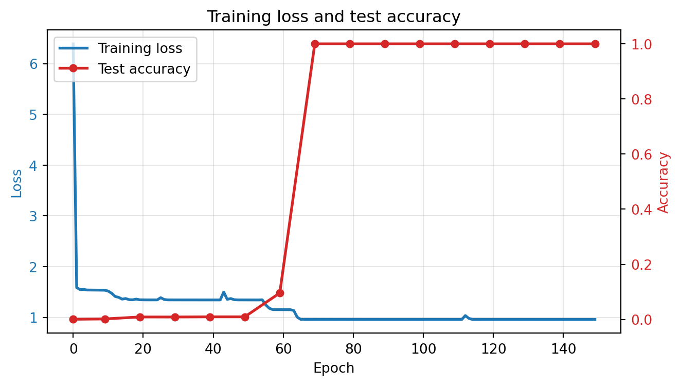 Epoch 150 | Loss: 0.9591 | Test accuracy: 100.0%
