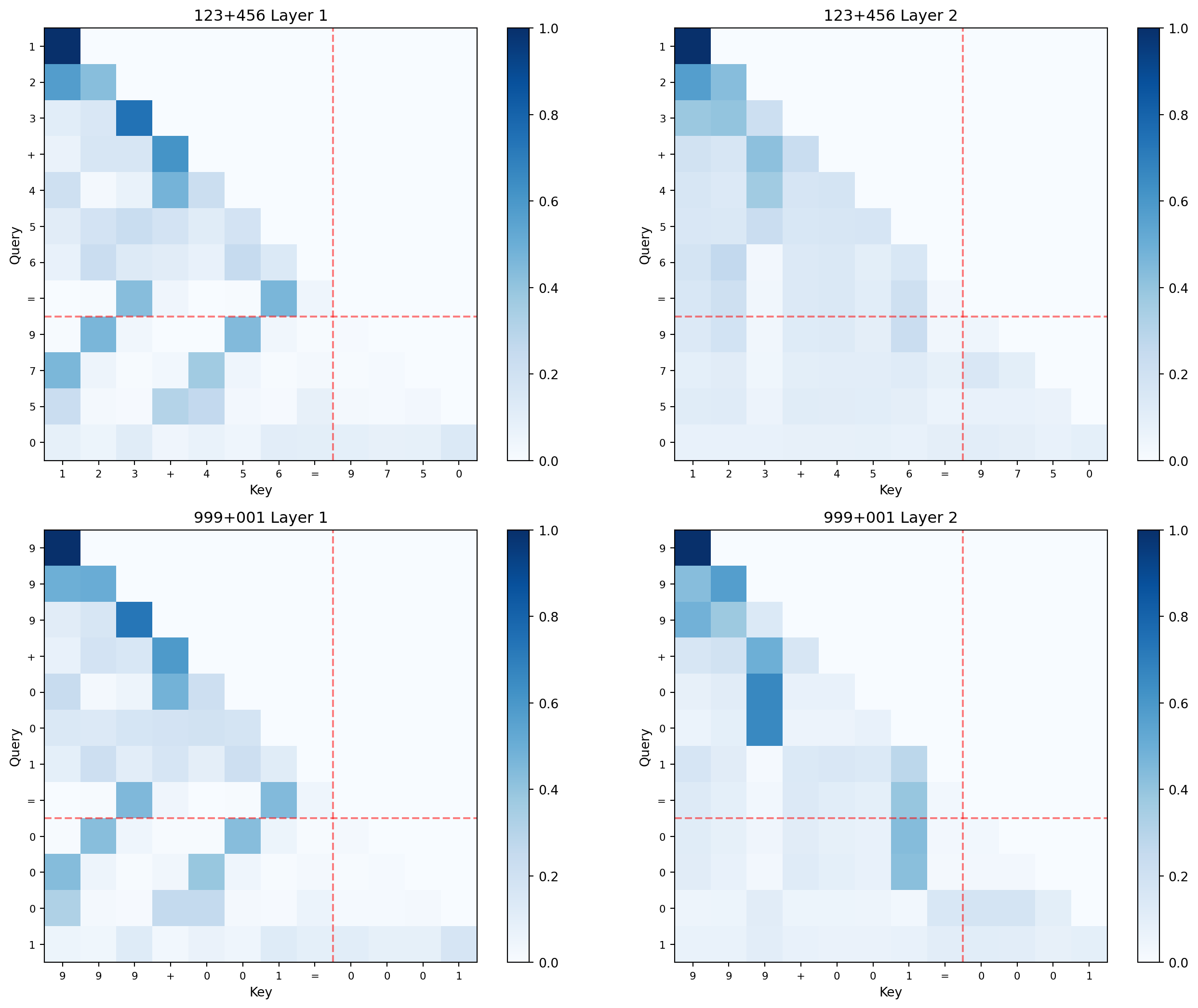Layer 1 typically handles column alignment: each output digit attends to the corresponding input digits (ones to ones, tens to tens). Look for bright spots where an output row crosses the correct input columns.