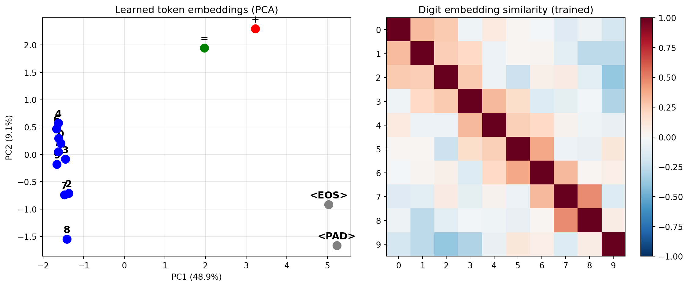 The model’s learned representations are interpretable. Attention patterns show column alignment and carry propagation. Trained embeddings cluster digits with similar arithmetic roles. This isn’t a black box — the internal structure mirrors the algorithm.