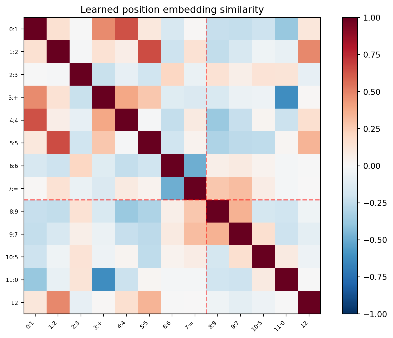 What would the position similarity matrix look like if positions didn’t matter? (Hint: if the model treated all positions interchangeably, what would the learned position embeddings converge to?) What does the actual structure tell you about which positions the model treats as similar?