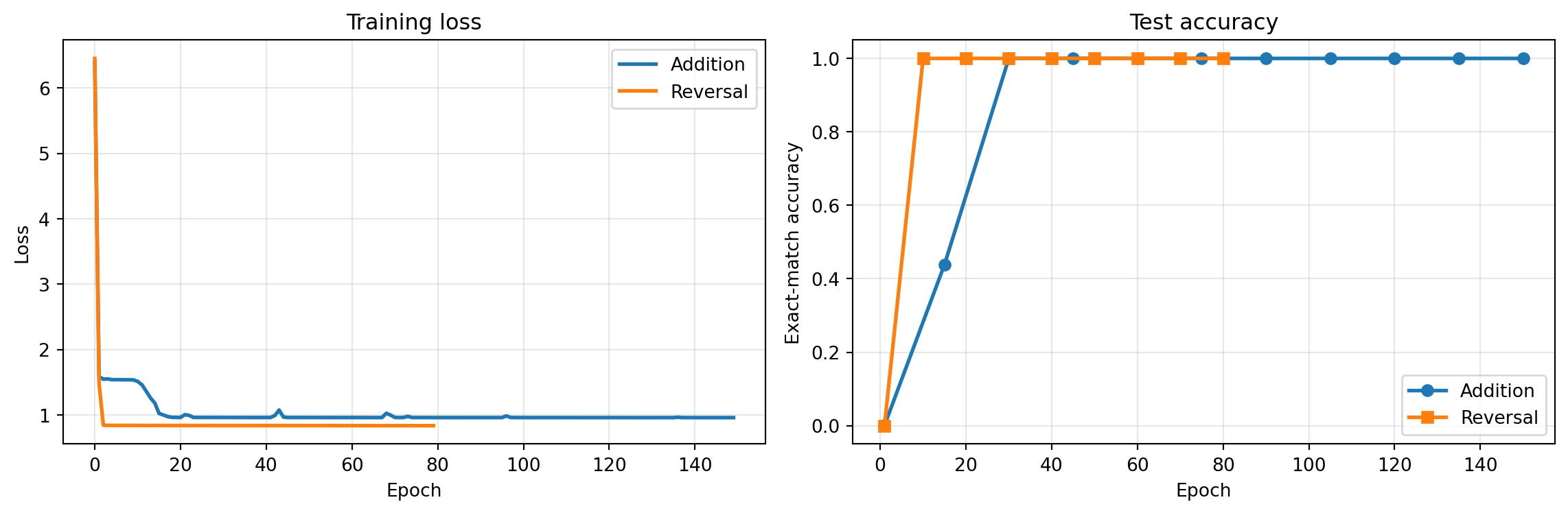 Reversal converges much faster — it’s a pure lookup task (position \(i\) maps to position \(n-i\)), no arithmetic required. Addition needs to discover column alignment and carry propagation, which takes longer and often involves a grokking phase transition.