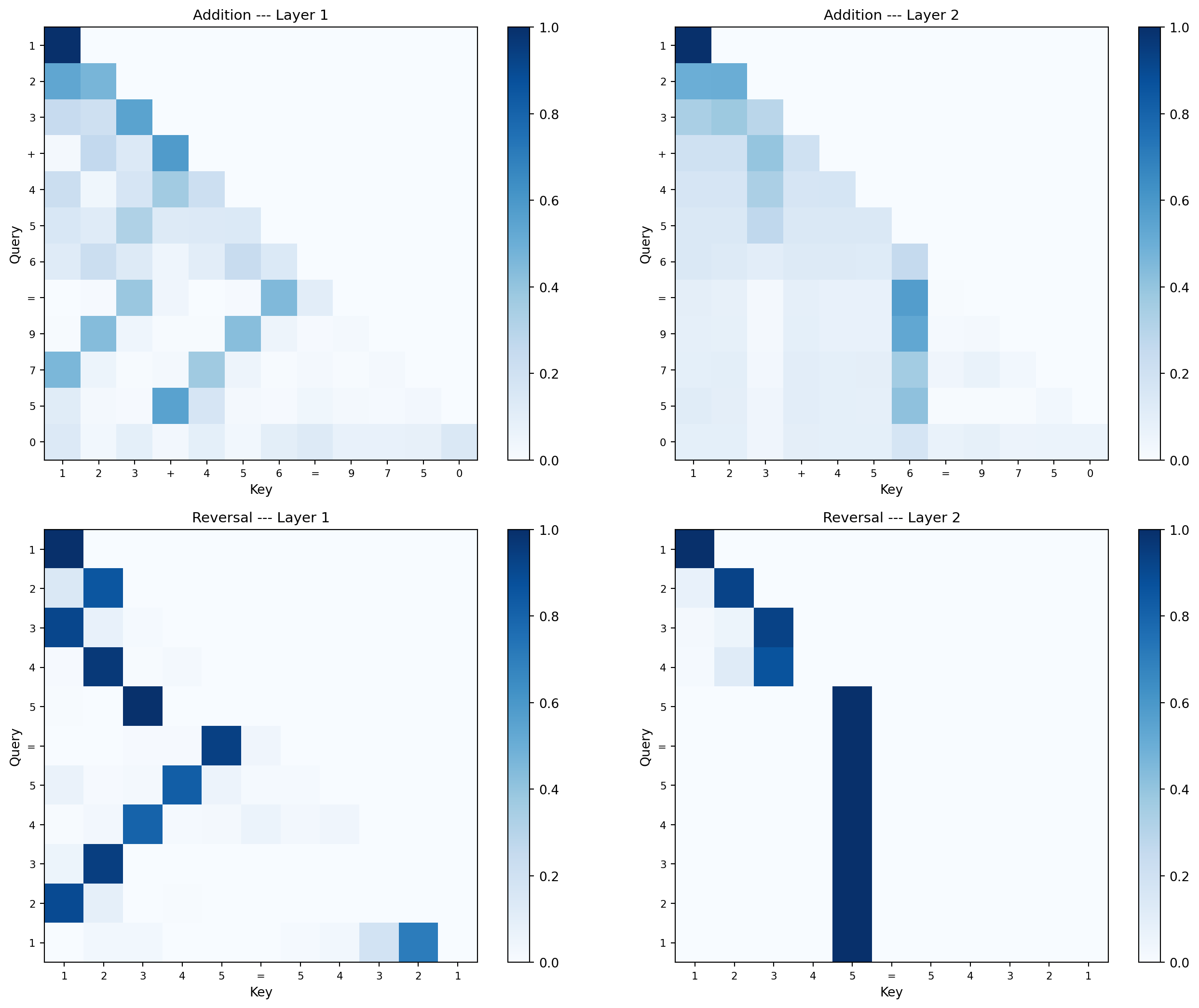 Reversal attention: Output position \(i\) attends to input position \(n-i\) — a perfect anti-diagonal. No carry computation needed, just mirror-pattern lookup.